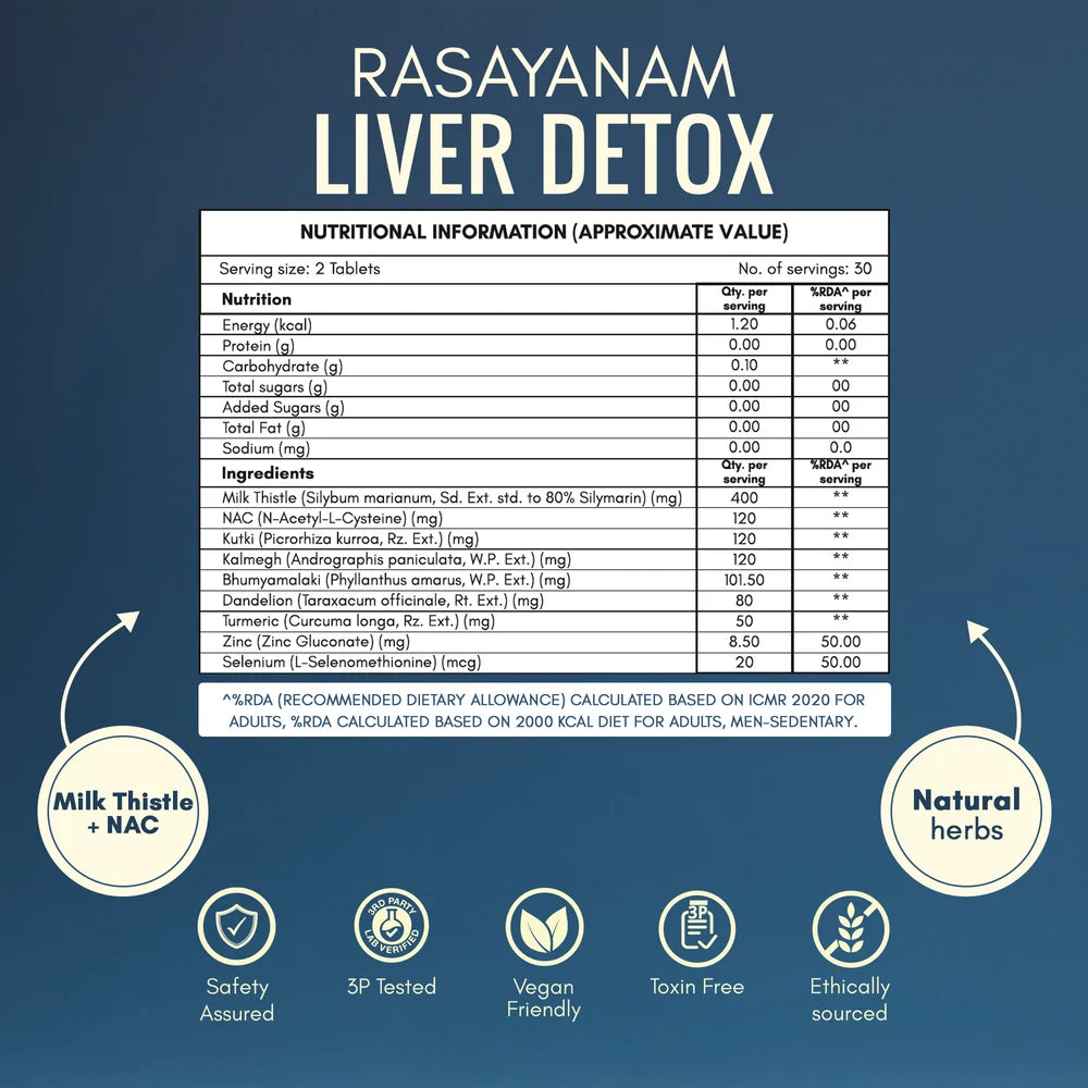 Rasayanam Liver Detox combines 9 liver-supporting ingredients to promote liver function and digestion, ease inflammation, and protect your liver from daily toxins.