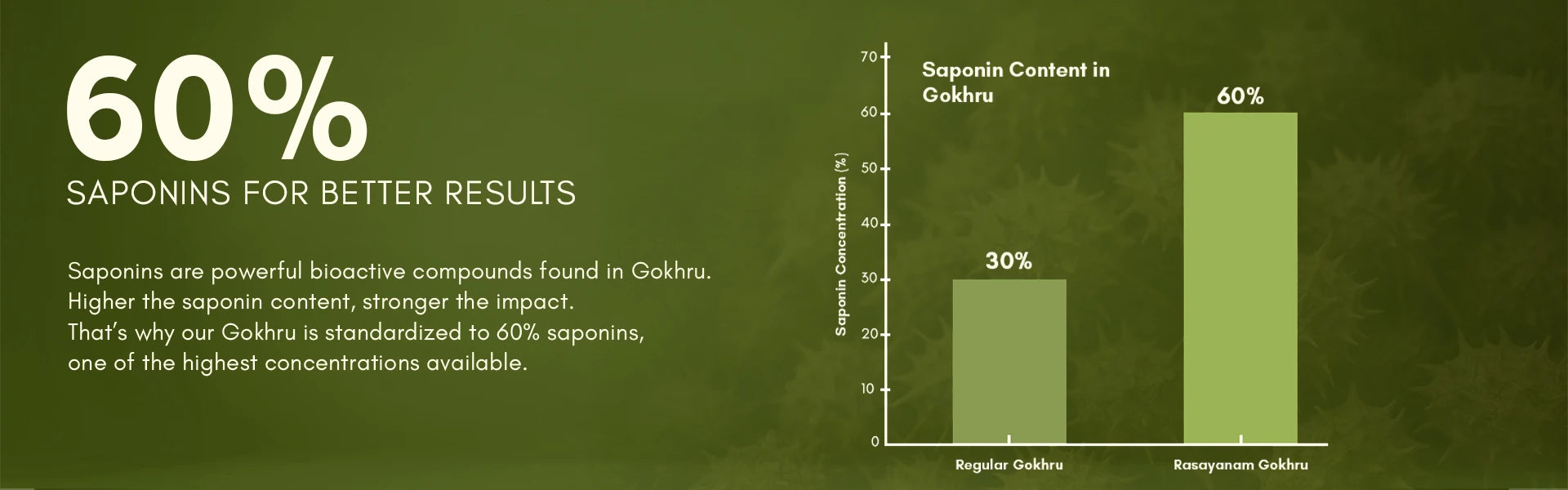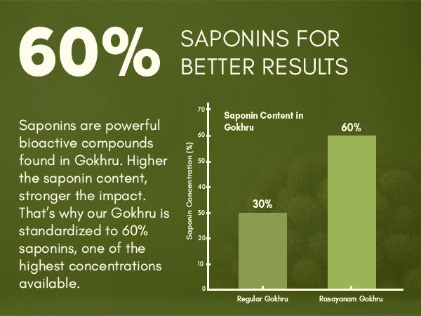 रसायनम गोखरू-60 में बाजार में उपलब्ध सबसे अधिक सैपोनिन सांद्रता (60%) है, जो इसे केवल 40% सैपोनिन वाले अन्य उत्पादों की तुलना में काफी अधिक शक्तिशाली बनाता है। यह उच्च सांद्रता तेज़ और अधिक प्रभावी परिणाम सुनिश्चित करती है।