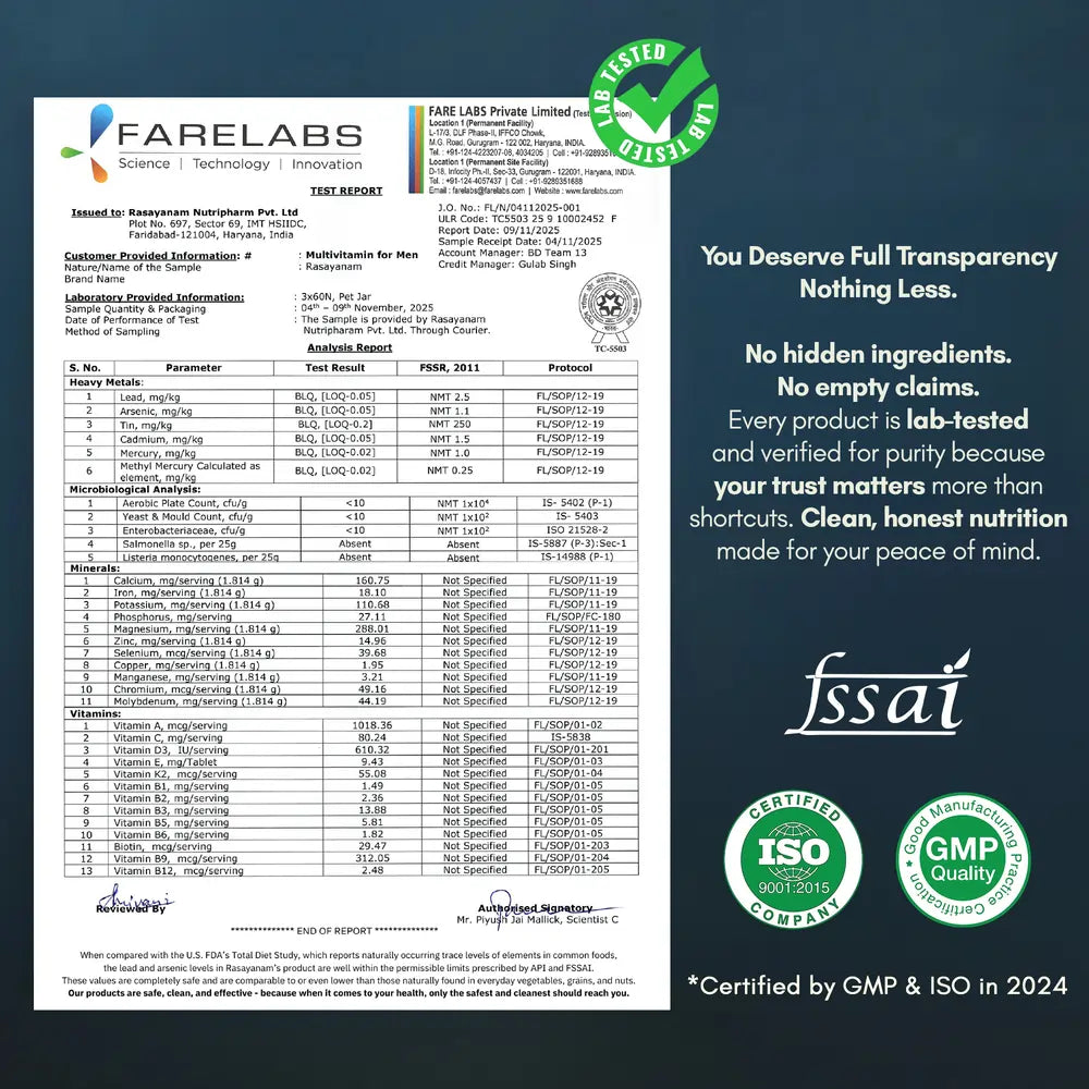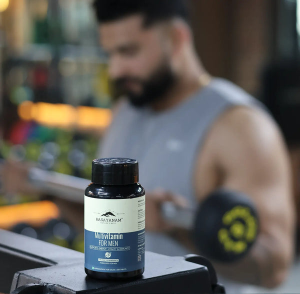 Ashwagandha, Mucuna (Kuch Beej), Gokshura, Ginseng, and Safed Musli. This adaptogenic blend helps balance stress hormones, support healthy T-levels, improve stamina, drive, and strength – keeping men active, focused, and resilient through demanding days.