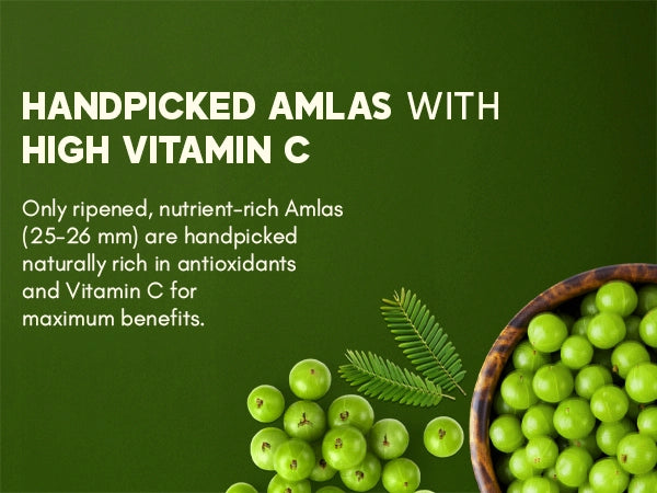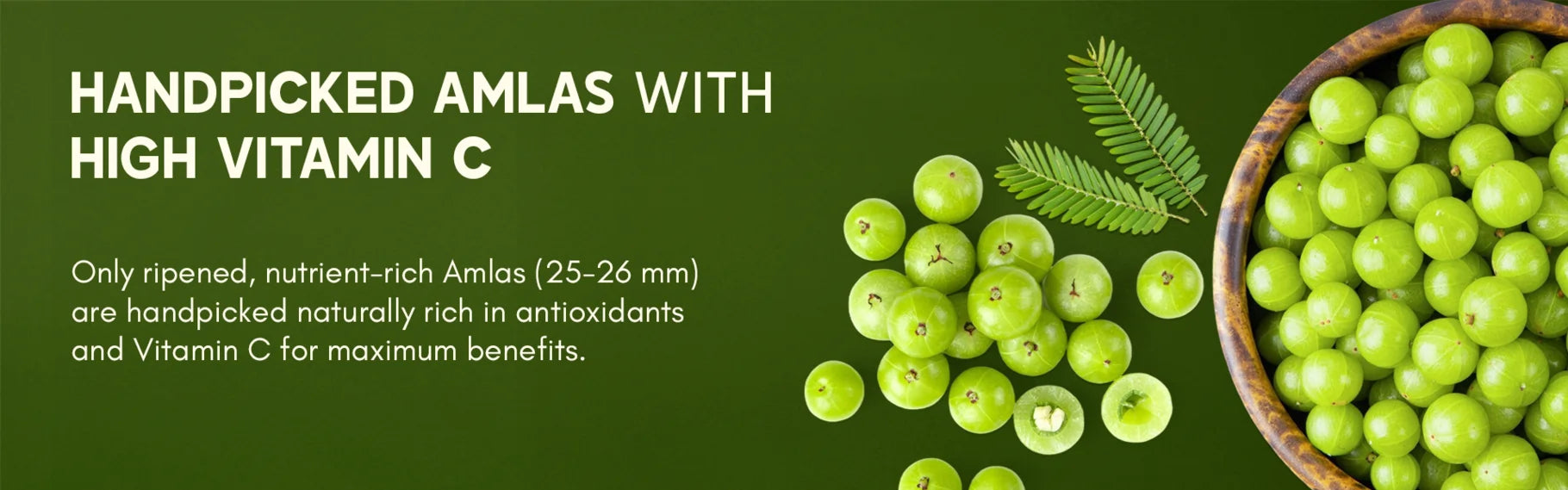 - High-quality handpicked amlas: We use only fresh, pulpy, small-sized amlas (25-26 mm) which are naturally richer in Vitamin C, antioxidants, and fiber compared to regular varieties.